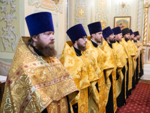 Его Высокопреосвященству сослужили почетный настоятель Сретенского храма г. Саратова протоиерей Василий Стрелков, настоятель Свято-Духовского собора г. Саратова протоиерей Сергий Догадин, первый проректор СПДС игумен Варфоломей (Денисов), духовник Саратовской епархии протоиерей Владимир Пархоменко, наместник Свято-Никольского монастыря г. Саратова игумен Никон (Поляков), ректор СПДС протоиерей Сергий Штурбабин, наместник Спасо-Преображенского монастыря г. Саратова игумен Макарий (Зорин), секретарь Саратовского епархиального управления иерей Игорь Москвичев, благочинный Центрального округа иерей Александр Чеботарев, настоятель Покровского собора г. Саратова иеромонах Никандр (Пилишин), благочинный Всехсвятского округа протоиерей Александр Домрачев, руководитель епархиального отдела по делам благотворительности и социального служения протоиерей Сергий Кляев, духовник Свято-Покровской православной классической гимназии г. Саратова иерей Ярослав Коздринь, благочинный Покровского собора г. Саратова иерей Сергий Филимонов, благочинный Петропавловского округа иерей Олег Грушин, настоятель Свято-Троицкого кафедрального собора г. Саратова иерей Александр Бородовицын, секретарь-референт епархиального архиерея иерей Андрей Фомин, иерей Павел Морозов, иерей Антоний Семеренко, иерей Георгий Полушкин, протодиакон Александр Пушкарев, протодиакон Олег Дроздов, диакон Тимофей Улямаев, диакон Иоанн Козлов, диакон Вячеслав Кичемазов.